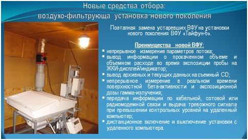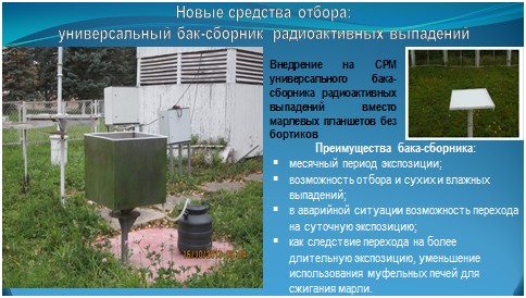 Были продолжены новые методы отбора и измерения радиоактивного загрязнения окружающей среды – баки-сборники радиоактивных выпадений, спектрометрические станции для измерения радиоактивного загрязнения, новые средства отбора и измерения радиоактивных аэрозолей.