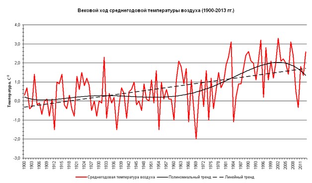 Теплый финал последних месяцев привел к тому, что среднегодовая температура 2013г. в Новосибирске (по данным агрометеостанции Огурцово) составила плюс 2,6С, что выше уровня прошлого 2012 года и нормы (плюс 1,3С). На фоне высокой межгодовой  изменчивости  температуры (см график) можно констатировать, что линейный тренд, построенный  новосибирскими климатологами, соответствует предположению о продолжающемся потеплении климата. Вместе с тем, полиномиальная (нелинейная) кривая указывает на нисходящую фазу векового хода температуры.