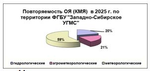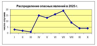 Из них в 60 случаях это были опасные метеорологические явления: наиболее часто отмечались комплексы неблагоприятных явлений – 19 случаев, очень сильные дожди и ливни интенсивностью до 30-69 мм/12 часов в теплый период - 10 случаев, очень сильный ветер 25-30 м/с - 11 случаев, аномально жаркая погода – 3 случая, очень крупный град диаметром 21-45 мм - 4 случая.