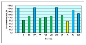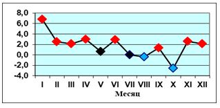 В температурном режиме год характеризовался лишь одной волной холода, отмечавшейся в октябре, ниже нормы на 2,6 °С, восемь месяцев температура превышала норму на 1,3-2,9 °С, самая крупная положительная аномалия температуры отмечалась январе – плюс 6,8 °С.