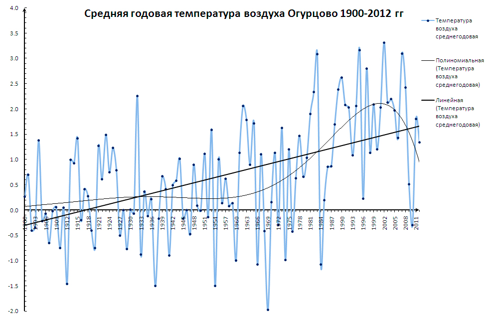 Несмотря на аномально жаркое лето, теплую весну и осень, среднегодовая температура 2012 г. в Новосибирске (по данным агрометеорологической станции Огурцово) оказалась на 0,5 С ниже, чем в 2011 г., и составила 1,3 С, что около нормы. Поэтому, нелинейная кривая тренда среднегодовой температуры, построенная климатологами Новосибирского Гидрометцентра, пока указывает на нисходящую фазу векового хода температуры (см. график). Вместе с тем, линейный тренд по-прежнему соответствует предположению о продолжающемся потеплении климата.
