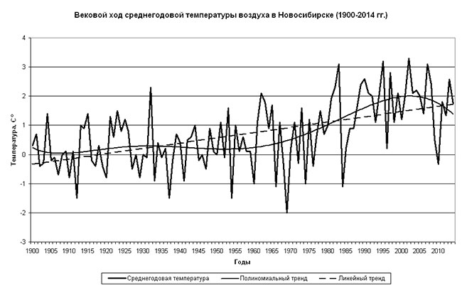 Ход среднегодовой температуры в Западной Сибири, в частности,  в Новосибирске (на примере агрометеорологической станции Огурцово) в последние 5 лет характеризуется значительными колебаниями. Минимум (минус 0,3С) отмечался в 2010 году – это была самая низкая температура в XXI веке. В 2013 году она «скакнула» до плюс 2,6С, что выше нормы (плюс 1,3С) более чем на градус, а в прошедшем 2014 году вновь понизилась почти на 1 градус (до плюс 1,7С), приблизившись к норме (см. график). Таким образом, линейный тренд (прерывистая линия) продолжает указывать на рост среднегодовой температуры в многолетнем разрезе. Вместе с тем, нелинейная (полиномиальная) кривая тренда (сплошная линия), построенная климатологами Новосибирского Гидрометцентра, указывает на вероятность нисходящей фазы векового хода температуры.
