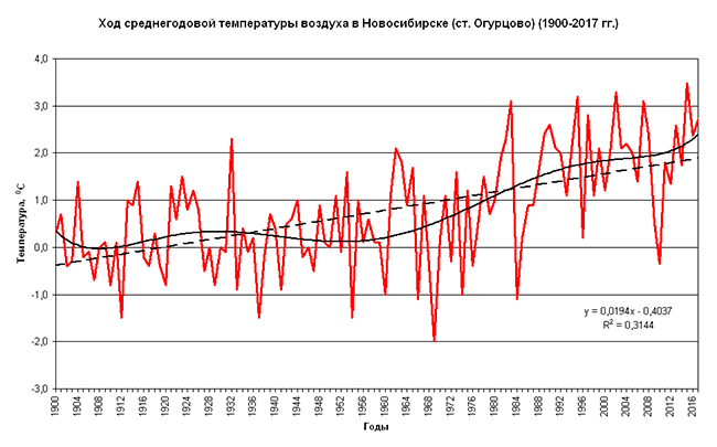 Процесс потепления климата на юго-востоке Западной Сибири среди других регионов выражен в меньшей степени. Среднегодовая температура в Новосибирске (по данным агрометстанции Огурцово) за 2017 г. составила плюс 2,7 0 С (при норме плюс 1,3 0 С) и занимает лишь 6 место в ряду самых теплых лет (см. таблицу)