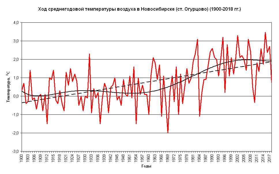 Для России среднегодовая температура за 2018 год занимает лишь 8-е место в ранжированном ряду (с 1891 года). Почти на всей территории России средняя за год температура была выше нормы: на европейской территории на 1…2 0 С, на азиатской – на 2…4 0 С. Продолжается потепление Арктики: впервые в разгар зимы температура воздуха на полюсе поднялась выше 00 С. Ученые подсчитали, что «ледовый панцирь» Арктики с конца 70- годов прошлого века ежегодно терял около 54 млн км 2 своей площади. И все же были на территории России регионы с отрицательной (до 10 С) аномалией среднегодовой температуры: некоторые районы Урала, Омская, Новосибирская, частично Кемеровская области и Алтайский край. В Новосибирске (станция Огурцово) средняя за год температура составила плюс 0,7 0 С (при норме 1,3 0 С), что на 0,6 0 С ниже средней многолетней температуры за 1971-2000 гг. Такой низкой температуры, как это следует из приведенного графика векового хода среднегодовой температуры , не было в Новосибирске с 2010 года. Основной вклад в падение температуры внесли январь, май и декабрь. И если в предыдущие годы как линейный тренд (прерывистая линия), так и полиномиальная кривая (сплошная линия) уверенно указывали на тенденцию дальнейшего потепления регионального климата, то с учетом 2018 года полиномиальная кривая приобрела нисходящую тенденцию. Таким образом, региональные тенденции климата могут не совпадать с глобальной картиной.