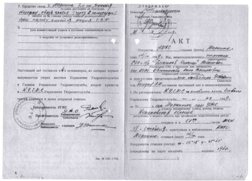 Бесценны документы, подтверждающие продолжение гидрометеорологических наблюдений в 1949 году. Тогда,  для обслуживания авиации, в Мариинском аэропорте появилась авиаметеорологическая станция (АМСГ), которая входила в состав Красноярского управления по гидрометеорологии и мониторингу окружающей среды. Начальником  была Овчинникова Нина Васильевна. Последним начальником АМСГ была Кириллова Валентина Анастасьевна. Она руководила станцией с 1971 по 1997 г.г.
