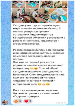 Для ознакомления с историей развития за почти два века существования Гидрометеорологической службы и популяризации деятельности сотрудники Кемеровского ЦГМС-филиала ФГБУ «Западно-Сибирское УГМС» 5 марта 2024 г. провели в школе № 99 г. Кемерово «открытый урок».